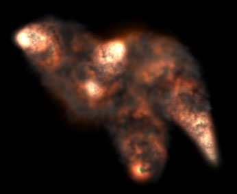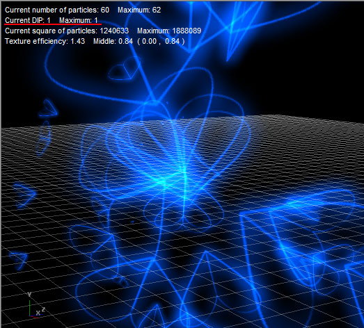 Notice, that particles of smoke are blended with particles of fire on this image, and you may see visual uniformity. However, you may also notice, that particles of fire use the property “Intense” for glow, and particles of smoke don’t use this property. Video card can use only one of modes at the same time. And you have to stop the process of drawing when the special effect is drawn, to change mode. The field “Current DIP” on scene shows, how many times the mode of video card was switched during drawing of special effect.