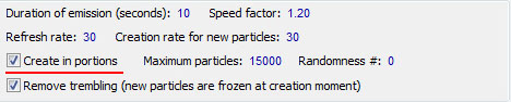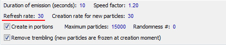 Practically, “Refresh rate” is smoothness of the particles movement. Try to understand the following: all calculations of special effect happen with that rate, which is shown in field “Refresh rate”, that is special effect doesn’t change between updates.