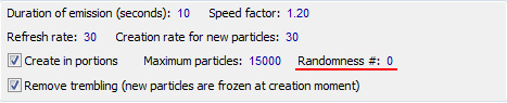 Recently, I have watched such thing: I sent a special effect, which was made from a lot of small particles, with only 2 velocity vectors for all particles (not random). In other words, if one particle moves to the right, other should go to the left. And it seems, everything visually works correctly, but if you look inside, you find out, that direction of movement and speed of all particles is chosen randomly! In this way, if you need the specific direction of movement, it is necessary to set the specific corner (diagram “Emission direction”). A programmer may turn on the full randomness of the emitter in API, and in this case all directions of movement will be changed. Besides, nobody guarantees, that the order of random numbers will not be changed in the new version of program Magic Particles. In such case particles will not move in necessary direction and you may do nothing. Summary: if you need specific values for parameters - use them. If you have red and blue lines on the diagram, you will get the values from this range randomly. Turn off one of lines, and then everything will be accurate. If you want to be sure, that your special effect does not depend on random values, change field “¹ randomness”.