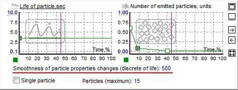 The complexity of processing of diagrams is in the fact that it is not trivial to define Y coordinate by X coordinate. Why does this happen? It is necessary to find the previous and subsequent points at first, and then, after receiving the formula of a straight or a curve between these points, to find out the appropriate point Y. It is not good, when a similar operation is constantly performed for every particle of the “red” diagram. So I have implemented following: before start of the emitter, all diagrams are pre-calculated with the certain step and all calculations stored in the array. Then diagrams are not used anymore, and all values are taken directly from this array. This approach gains a high speed for API working with diagrams. But… we have an important question: how should we select the length of array? There is additional property “Smoothness of particles properties changes (discrete of life)” on diagram “Life of particle, sec”. This number defines the length of arrays, in which the “red” diagrams are converted. In order to get smooth behavior of the particles, this number should be increased. For example, if particle is changing size significantly during lifetime, you should find out the value, at which this animation will be without jerks. If you write “Smoothness of particles properties changes (discrete of life)” = 5, that all “red” diagrams will be divided into 5 parts and the particle will have only 5 sizes. You will notice artificial animation, because of the abruptly change of particle size. In general, the greater the number you set, the smoother change will be. But… the arrays in memory will increase too. The numbers in the arrays is kept as floats (4 bytes). So, don’t write 5000 there, where it will be better to set 100.